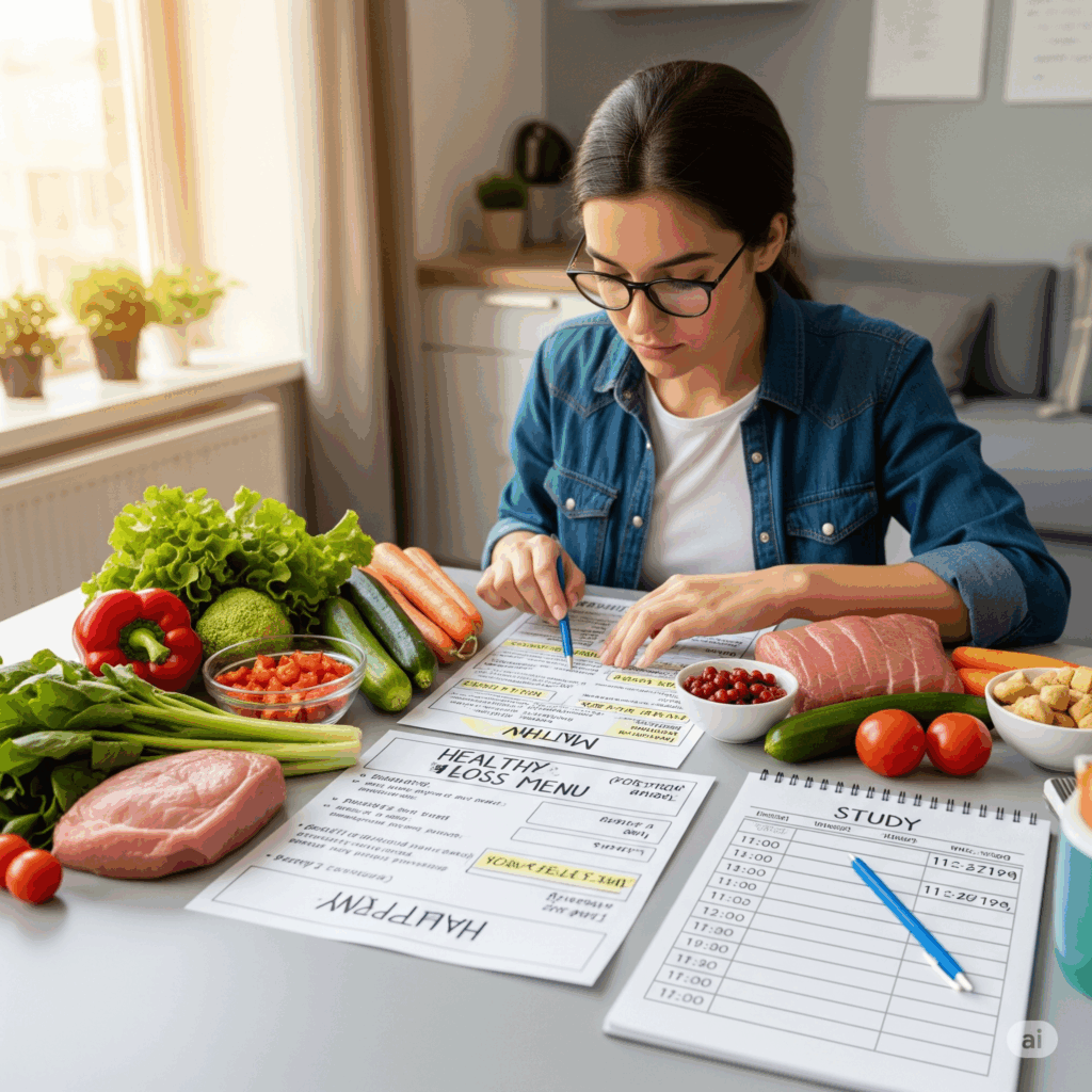Thực đơn giảm cân (~1200-1500 kcal/ngày) được thiết kế đơn giản, dễ chuẩn bị, phù hợp túi tiền và lịch học:
