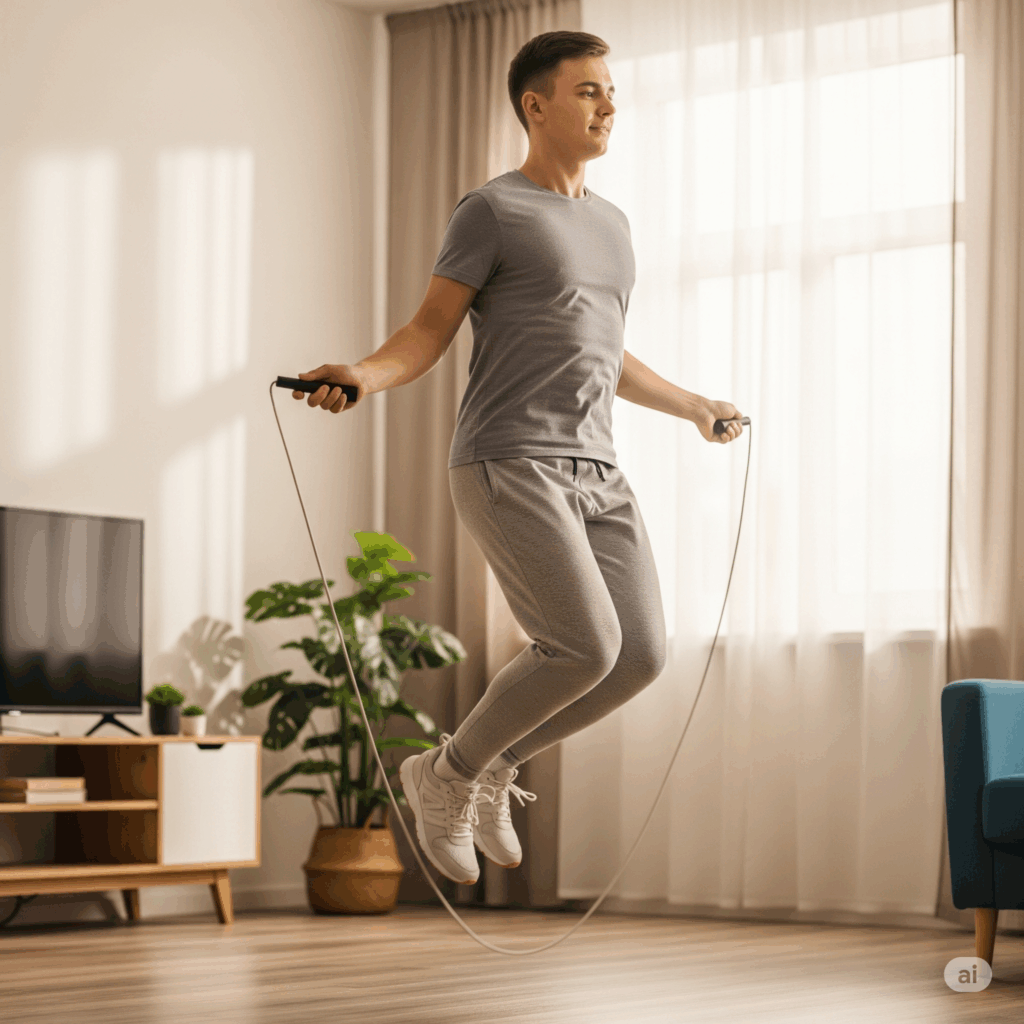 - Cách làm: Nhảy dây 10 phút, nghỉ 30 giây mỗi 2 phút, giữ vai thả lỏng.